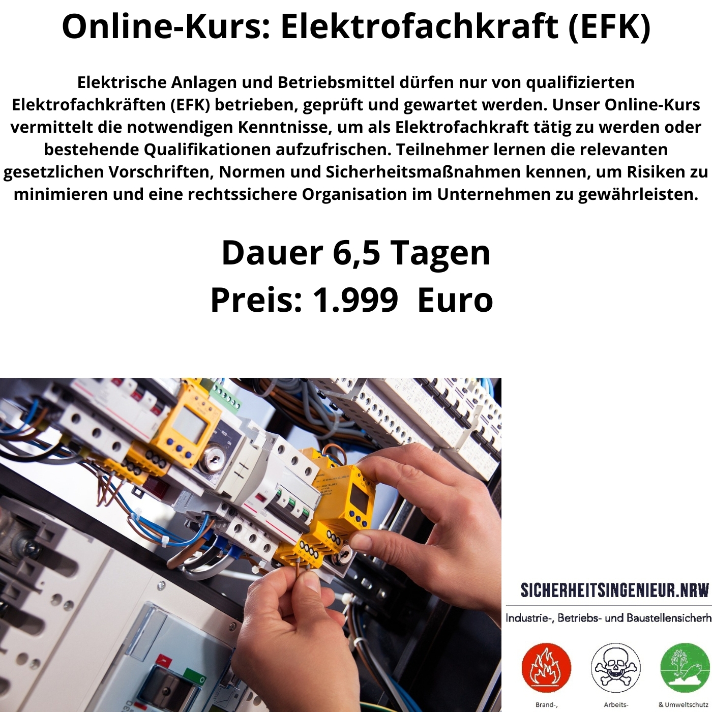 Elektrische Anlagen und Betriebsmittel dürfen nur von qualifizierten Elektrofachkräften (EFK) betrieben, geprüft und gewartet werden. Unser Online-Kurs vermittelt die notwendigen Kenntnisse, um als Elektrofachkraft tätig zu werden oder bestehende Qualifikationen aufzufrischen. Teilnehmer lernen die relevanten gesetzlichen Vorschriften, Normen und Sicherheitsmaßnahmen kennen, um Risiken zu minimieren und eine rechtssichere Organisation im Unternehmen zu gewährleisten.